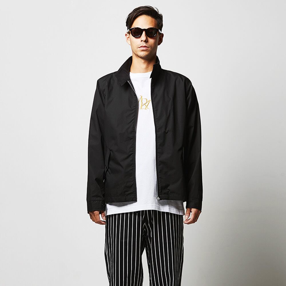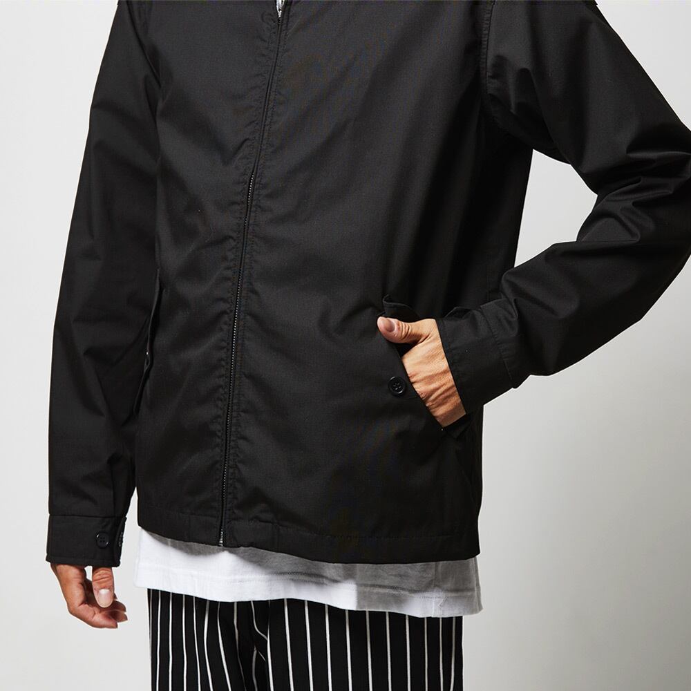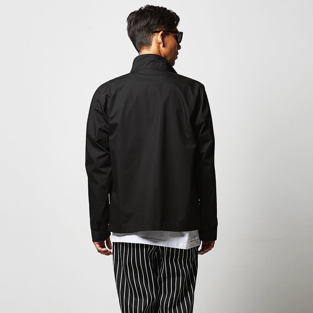 表地は、ポリエステルの耐久性と綿の快適性を兼ね備えた型崩れの少ないT/Cウェザー。立ち襟のリブ使いにより厚みが増した美しいシルエットです。リブは毛玉ができにくく、肌ざわりも滑らか。袖口に備えたカフスボタン2つによる調整が可能で、もたつきを防ぎます。ファスナーはYKK社製シングルスライダー。裏地は身生地と同色で、プリントをおこなう際の加工板が入るふらし仕様となっています。